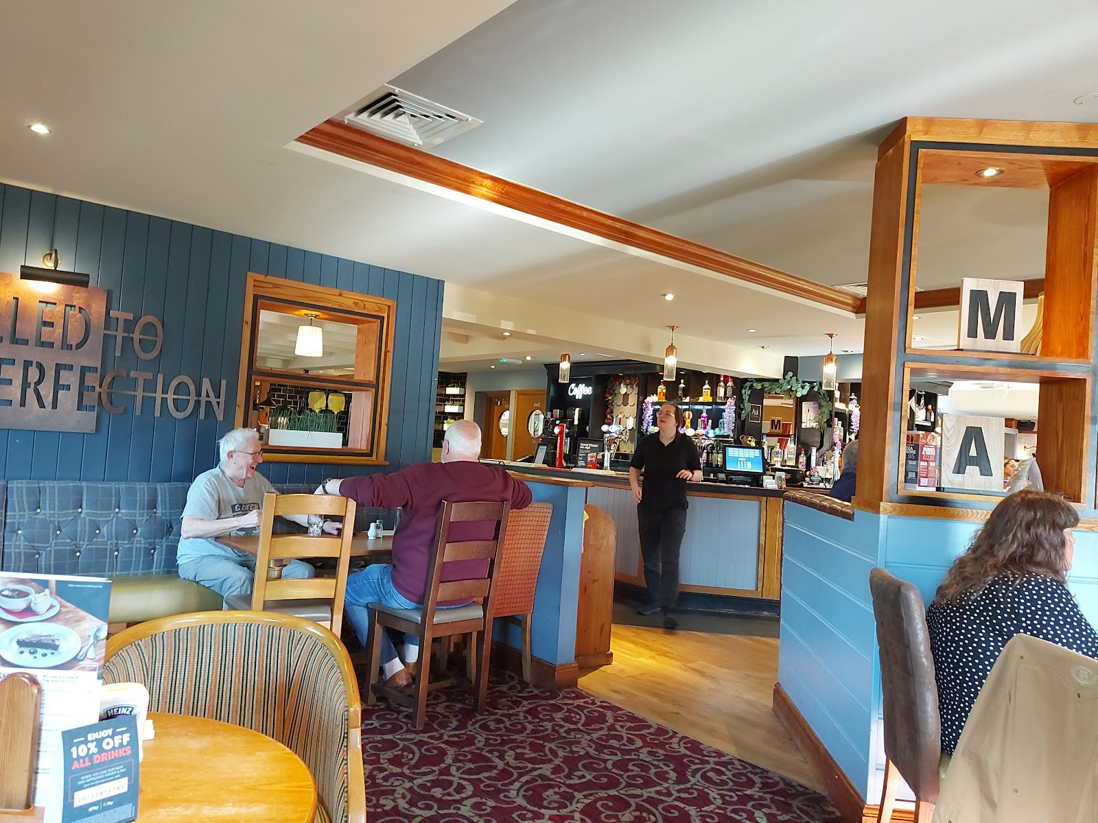 Lovely friendly staff the pub was really clean and lots of places to sit. We were greeted as soon as we arrived and shown a table. Served very quickly with drinks and food order taken.