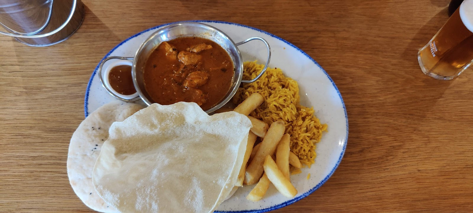 Visited The Whistling Wren, Leigh for lunch with 3 friends on 10/7/24. Staff were friendly and welcoming. Service, food and drinks were very good. We all had special offer Madras Currys with loaded chips on the side with pints of Pedigree or Wainwright's cask beer. Excellent.